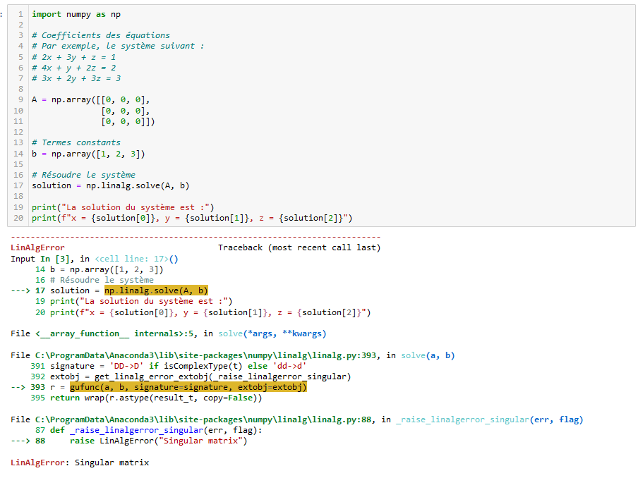 En fait non, pas de soucis avec l’informatique, mais le script Python de Chat GPT ne vérifie pas si le système contient une infinité de solutions, aucune solution, ou une seule, en vérifiant si la matrice A est inversible (bon en fait Python nous dit que la matrice est singulière mais il faut lire jusqu’au bout, gros effort, et savoir ce qu’est une matrice singulière).