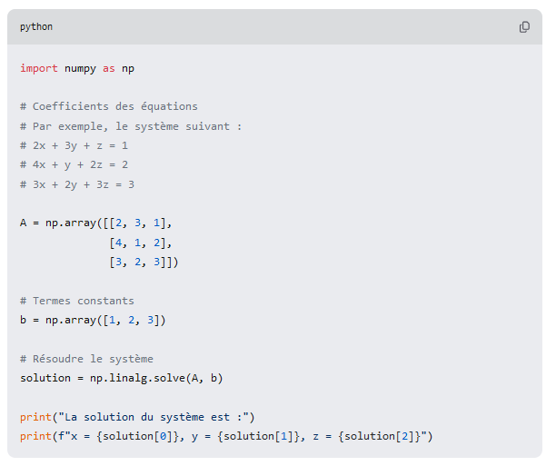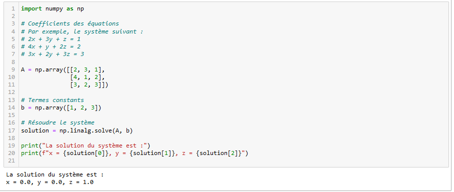 Ce script définit un système d’équations linéaires sous forme matricielle, puis utilise la fonction np.linalg.solve pour trouver la solution. Vous pouvez modifier les coefficients et les termes constants dans les matrices A et b selon votre système spécifique.