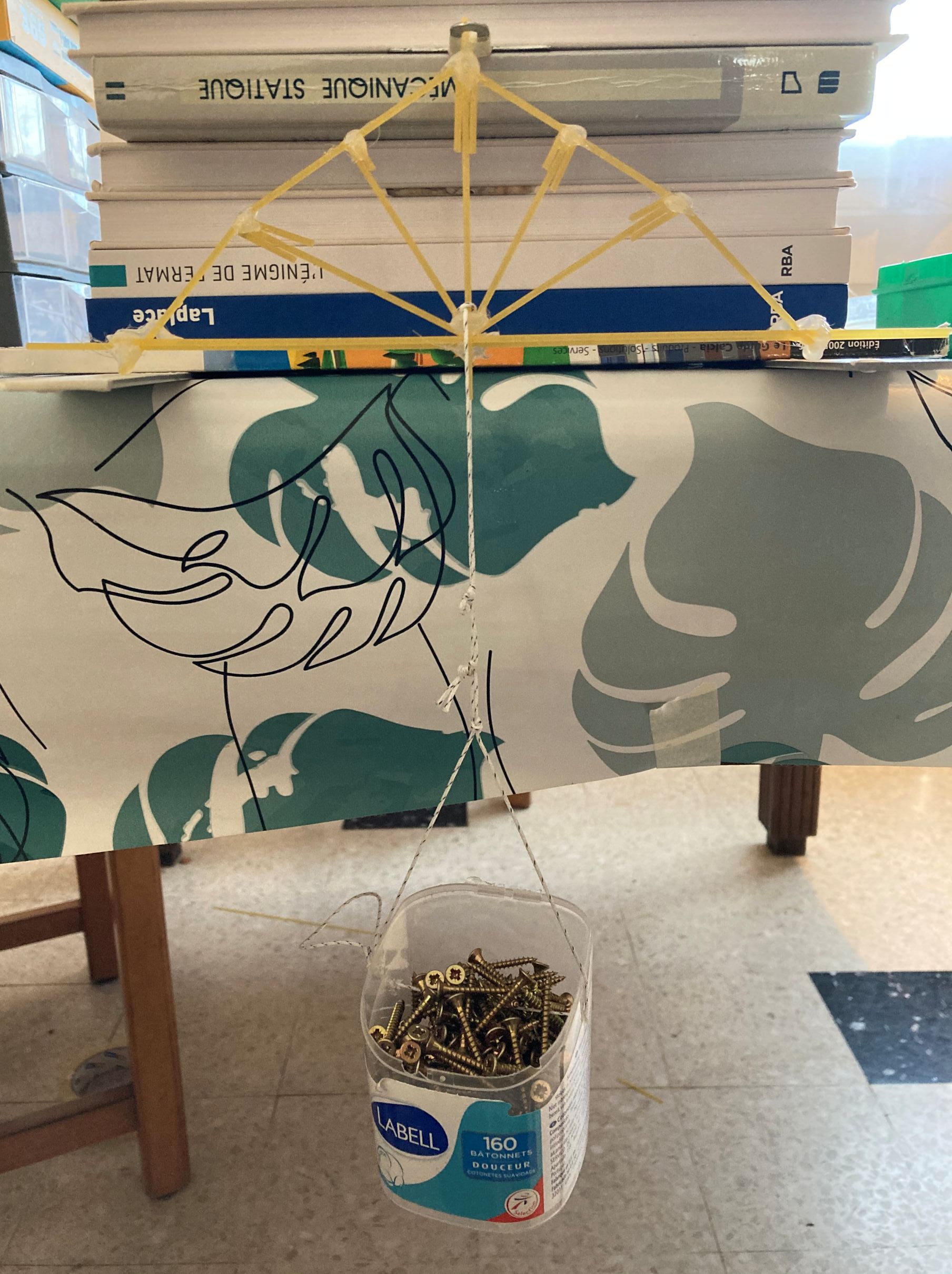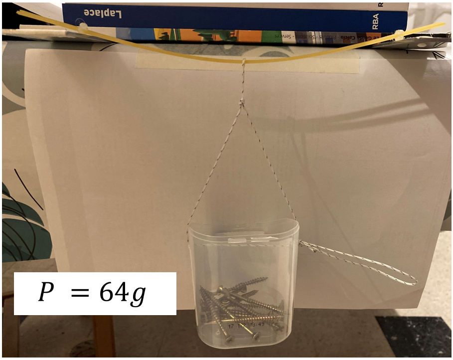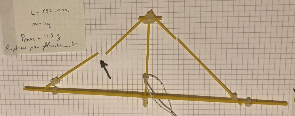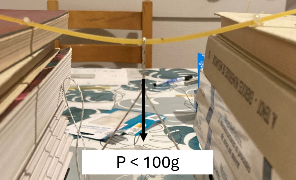Si l’on prend deux spaghettis, qu’on en fait un petit pont de longueur 19,2 cm, et qu’on applique un poids au milieu, le poids maximal n’est pas fameux : 100g…..