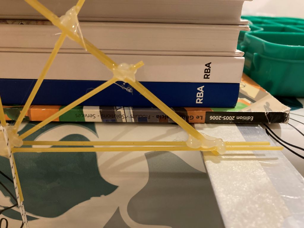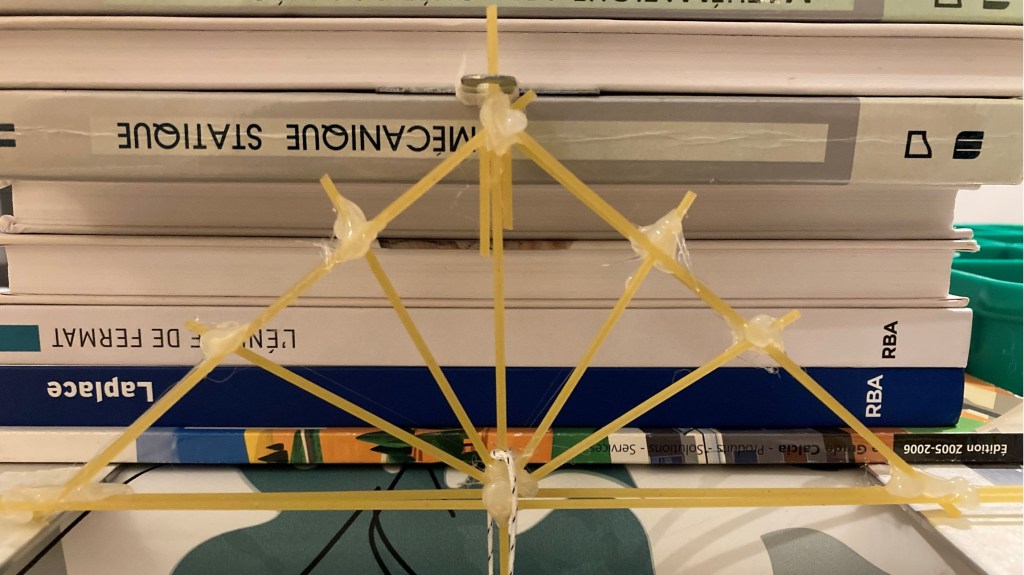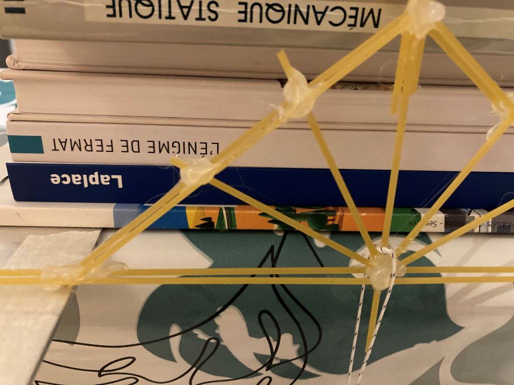 Après le pont à haubans de cet été avec du fil et du carton, j’expérimente les treillis en spaghetti !