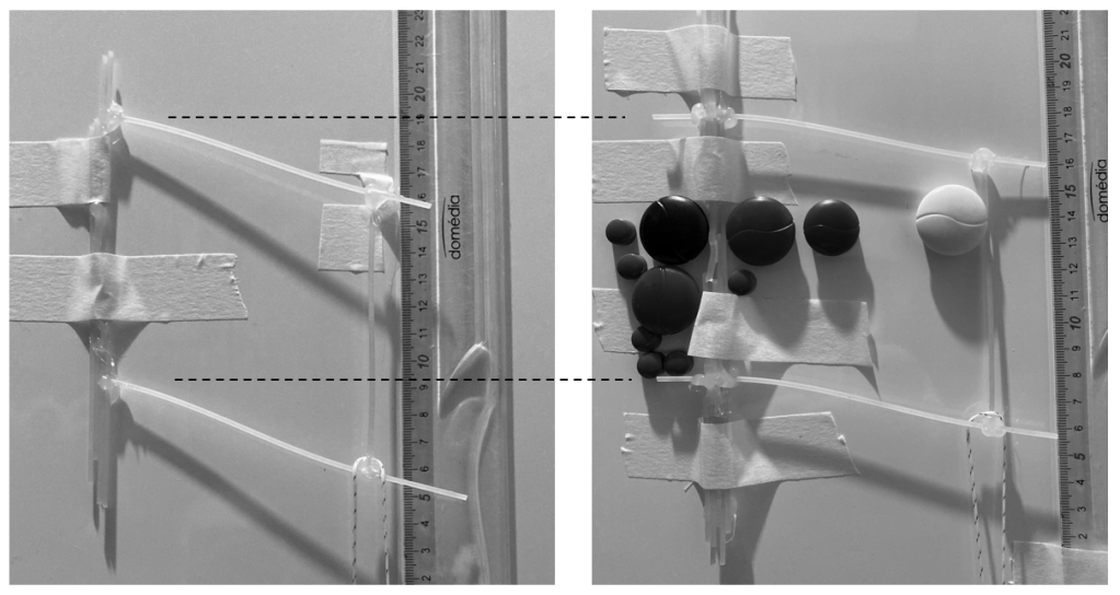 Sur la photo de gauche, on voit que les points de colle aux appuis laissent le spaghetti avoir un peu de rotation (si aux appuis la colle ne bloquait pas du tout la rotation, le système aurait un mouvement de solide rigide….). Ci-dessous on a renforcé la liaison aux appuis, on voit aussi l’importance sur la déformée.