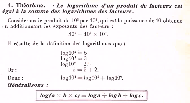 On comprend aussi aisément les propriétés usuelles du logarithme :