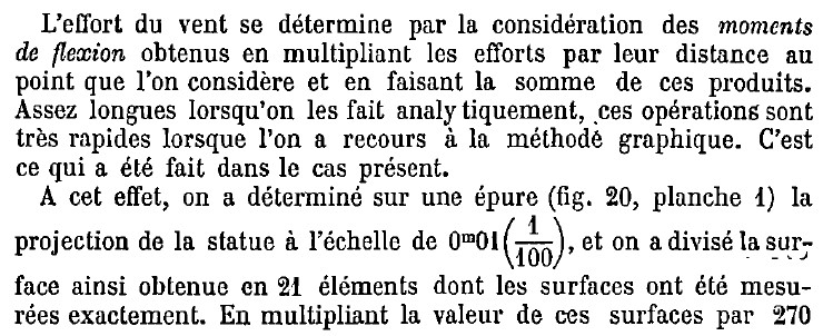 Le vent est une charge répartie sur toute la statue. Il semble qu’Eiffel ait discrétisé cette charge en 21 segments (pour la discrétisation d’une charge répartie, voir fiche statique graphique-2).